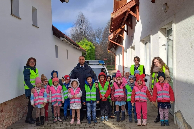 A vidám hangulatú látogatás végén a lelkes kis társaság testközelből is megismerkedhetett a rendőrök által alkalmazott felszerelésekkel és eszközökkel, továbbá beülhettek egy megkülönböztető jelzést használó rendőrautóba is. Az élménydús nap zárásaként a rendőrség munkatársai láthatósági mellényekkel ajándékozták meg apró vendéglátóikat.