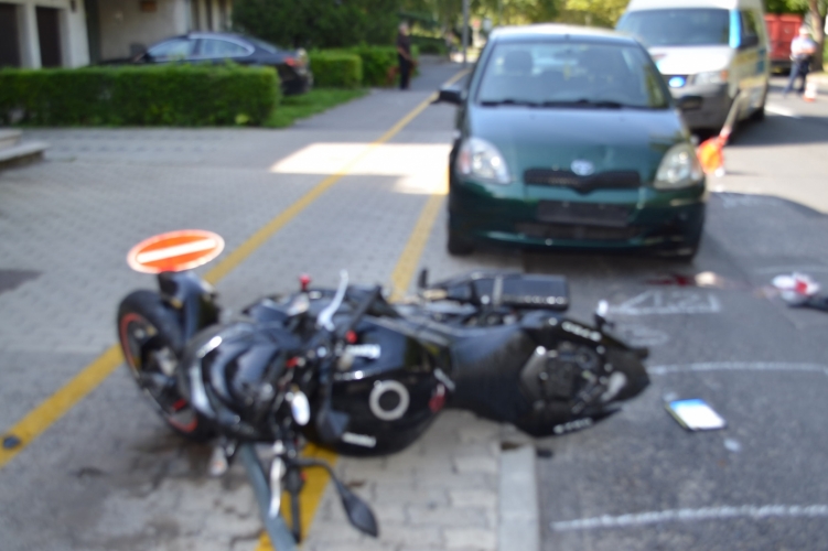 A motoros a balesetet elkerülni nem tudta és a személygépkocsi bal első kerekének majd továbbvágódva a menetirányát tekintve a bal oldali járdán lévő közúti jelzőtáblának ütközött.