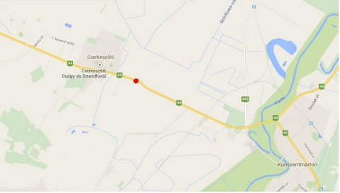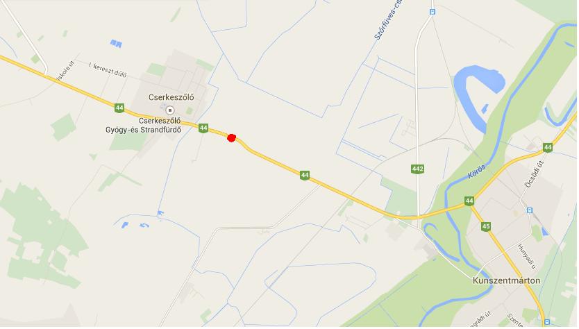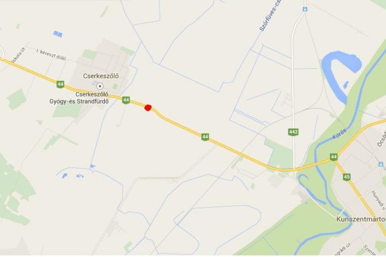 Személyi sérüléssel járó közúti közlekedési baleset történt 2015. január 15-én 14 óra 45 perckor Kunszentmárton és Cserkeszőlő között, a 44-es számú főút 46. kilométerszelvényében. A jelenleg rendelkezésre álló adatok szerint egy személygépkocsi és egy tehergépkocsi ütközött. A rendőrök teljes útlezárás mellett kezdték meg a baleset helyszínelését és a főút forgalmát a 442-es számú útra Tiszaföldvár felé, illetve a 4514-es útra Csépa felé terelik.
