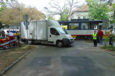 A kórházba szállítást követően meghalt egy szegedi férfi, akit elsodort egy villamossal ütköző gépkocsi 2017. április 26-án, Szegeden.