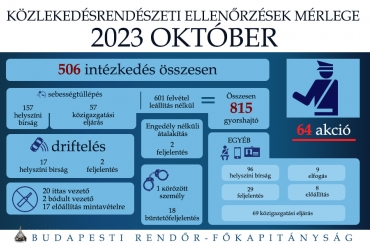 A budapesti rendőrök 2023 októberében 64 alkalommal tartottak ellenőrzést a főváros útjain a balesetek, az illegális gyorsulások, „driftelések” és engedély nélküli jármű-átalakítások megelőzése, megszakítása és szankcionálása céljából. Összesen 815 gyorshajtó akadt fenn a rostán.