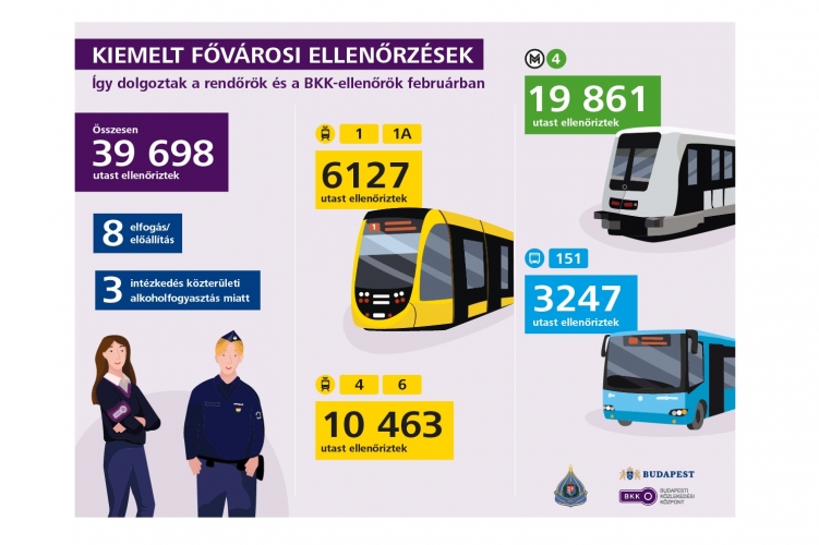 A Budapesti Rendőr-főkapitányság a Budapesti Közlekedési Központtal kötött stratégiai partnerség keretében idén is rendszeresen tart ellenőrzéseket a közösségi közlekedési eszközökön az utasok biztonsága érdekében. Az év második hónapjában a 151-es autóbuszokon, az M4-es metrókon, valamint az 1A, 1-es, 4-es és a 6-os villamosokon, megállóhelyeken és az aluljárókban tartottak ellenőrzést.