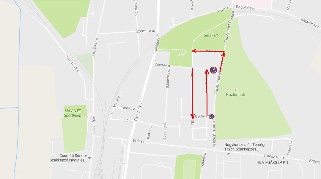Forgalmi rend változás lép érvénybe 2016. október 29-én 8 órától 2016. november 2-án 8 óráig a Kiserdei úton és az Újtemető előtti útszakaszon, a Kiserdei út – Gébárti út kereszteződésétől a Kiserdei út – Kaszaházi út kereszteződéséig (körforgalom), ahol a forgalom egyirányúvá válik.