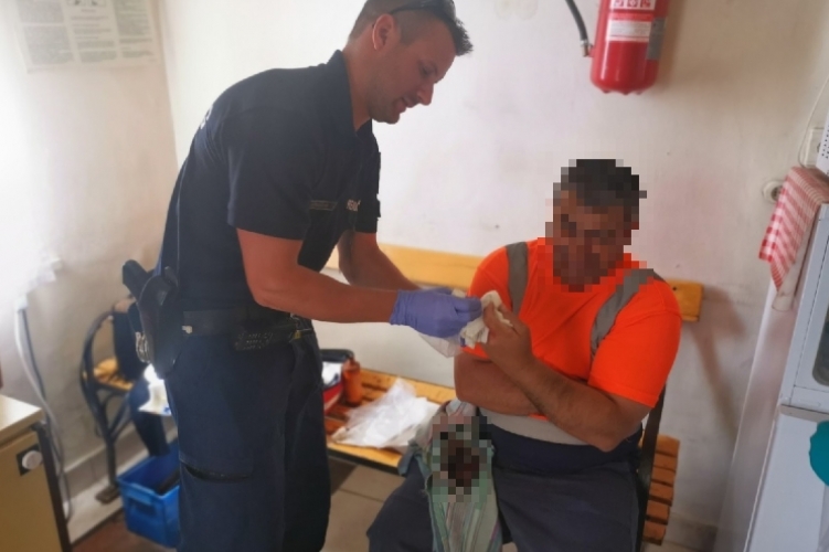A segélyhívásra elsőként érkező járőrpár egyik tagja - aki korábban mentő gépkocsivezetőként dolgozott másodállásban - előkapta a szolgálati gépjárműből egészségügyi felszerelését, és késlekedés nélkül megkezdte a sérült ellátását. Míg ő fertőtlenítette az ujjakat, majd fedőkötéssel látta el a sebesülést, társa a forgalomirányító helyiségben lévő hűtőszekrény fagyasztórekeszéből kikaparta a jeget, amit aztán egy nejlonzacskóba szórt. Az egyik ujjdarabot ugyanis a sérült férfi addig egy papírzsebkendőben szorongatta. Mire a mentőegység a helyszínre ért a sérülést ellátták, az ujjpercet jegelték, megadva az esélyt a visszaoperálásra.