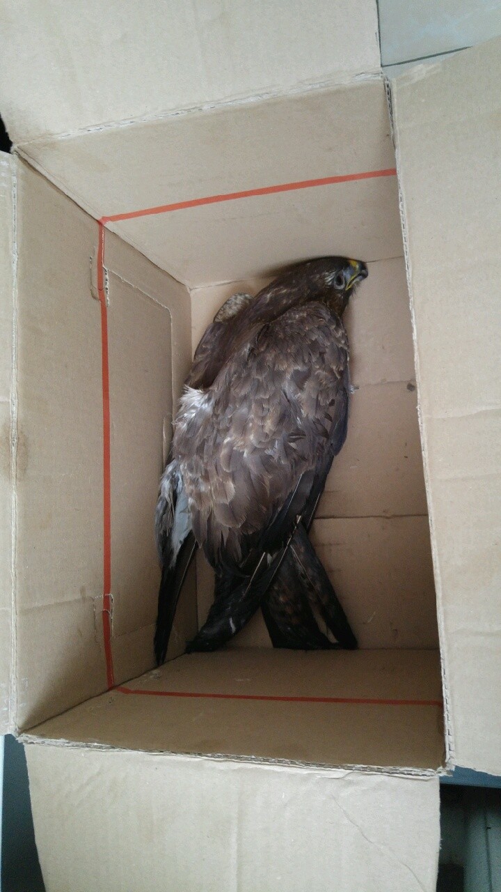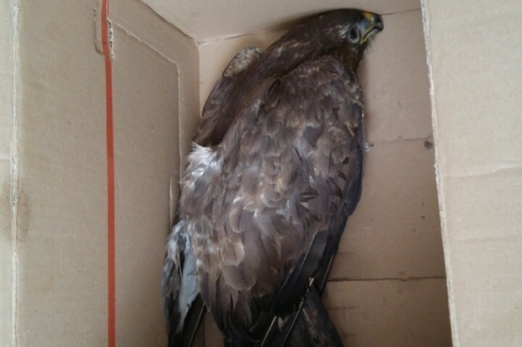 A járőrök a bejelentő lakásához mentek, ahol átvették az ölyvet, amelynek a lábán sérülés volt, a szárnyát nem mozgatta, de még mutatott életjeleket.