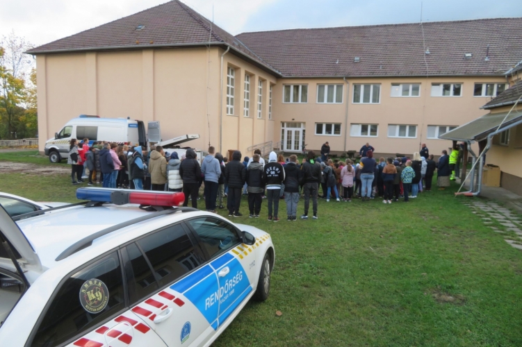 A tréning mellett a felkészítésen részt vevő kutyavezetők és négylábú társaik a diósjenői Szentgyörgyi István Általános Iskola tanulói számára is tartottak egy rövid bemutatót és tájékoztatást adtak a gyerekeknek a szolgálati kutyák feladatairól és képzéséről.