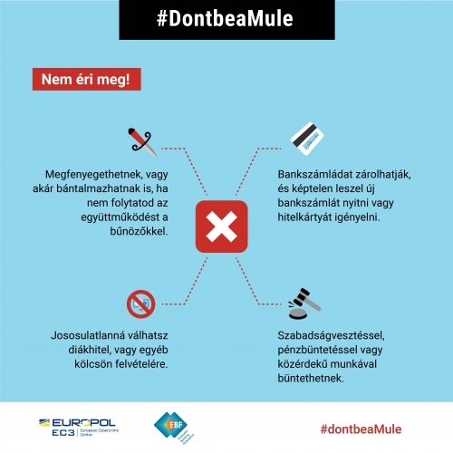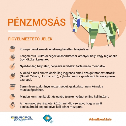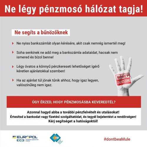 December elején az Europol 26 ország rendőreivel, köztük a magyar rendőrséggel közösen, illetve nemzetközi partnereivel, az Interpollal, az Eurojusttal és az Európai Bankszövetséggel és a pénzügyi szféra nagyobb szereplőivel összefogva tudatosító kampányt indított a pénzmosó hálózatok veszélyeiről és a gyanútlan pénzátutalások teljesítésének kockázatairól #DontBeaMule (ne legyél pénzmosó hálózat tagja) hashtag alatt. A tudatosító kampány az idén már kilencedik alkalommal megrendezett EMMA (European Money Mule Action) akció része, mely során nemzetközi szinten idén is többezer gyanútlan pénzmosót és több száz szervezőt azonosítottak.