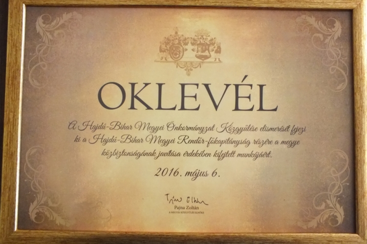 A Hajdú-Bihar Megyei Közgyűlés elnöke díszoklevelet adott át Dr. Gyurosovics József r. dandártábornoknak, amellyel a Hajdú-Bihar Megyei Rendőr-főkapitányság részére megköszönte a tavalyi évben a közbiztonság javítása érdekében kifejtett munkát. A közgyűlés idén az „Év rendőre Hajdú-Bihar megyében” elnevezéssel elismerést is alapított. Az ezzel járó emlékérmet szintén Pajna Zoltán adta át, először Asztalos János r. alezredesnek, a Hajdúhadházi Rendőrkapitányság vezetőjének a 2015. évben végzett munkájáért.