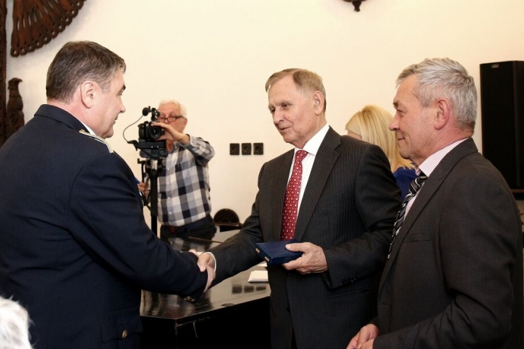 A képen Dr. Marcsek Sándor r. ezredesnek (balról) gratulál az elismeréshez Széles János a Tolna Megyei Polgárőr Szervezetek Szövetségének elnöke, középen Dr. Túrós András az OPSZ elnöke