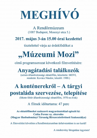 Filmvetítést tart a Rendőrmúzeum 2017. május 3-án a múzeum Mosonyi utcai épületében (1087 Budapest, Mosonyi utca 5.).