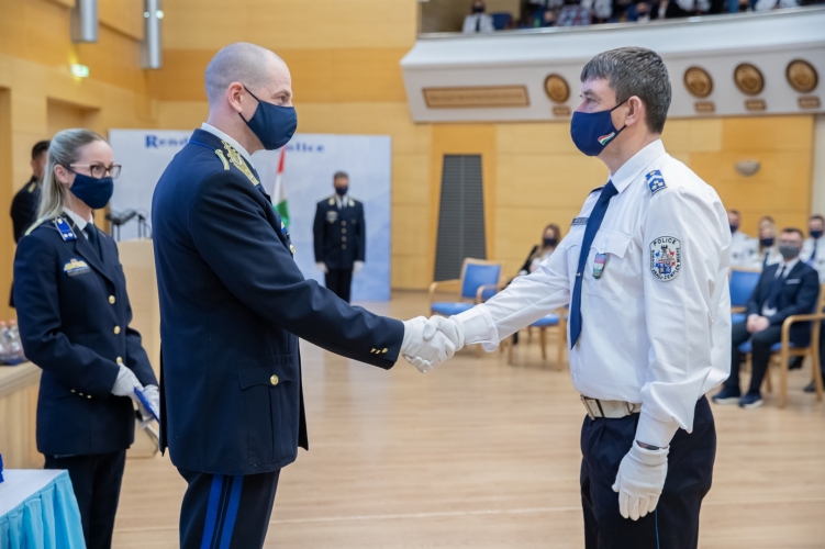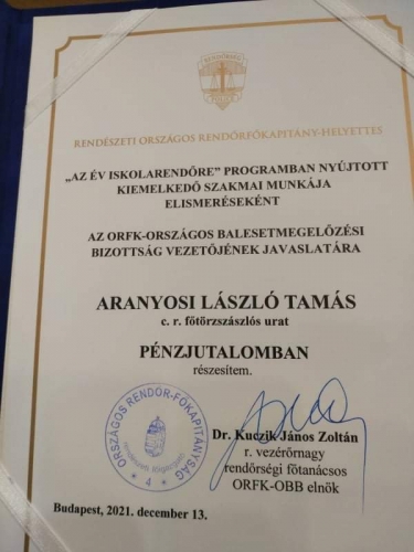 Az elismerésről szóló emléklapot munkatársunk 2021. december 13-án vette át Budapesten, a Rendőrségi Igazgatási Központban megtartott iskolarendőr szakmai napon dr. Kuczik János r. vezérőrnagy, rendészeti országos rendőrfőkapitány-helyettestől, az ORFK-Országos Balesetmegelőzési Bizottság elnökétől.