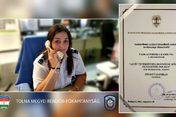 A Tolna Megyei Rendőr-főkapitányság Tevékenység-Irányítási Központjának munkatársa kimagasló szakmai tevékenységéért elismerésben részesült.