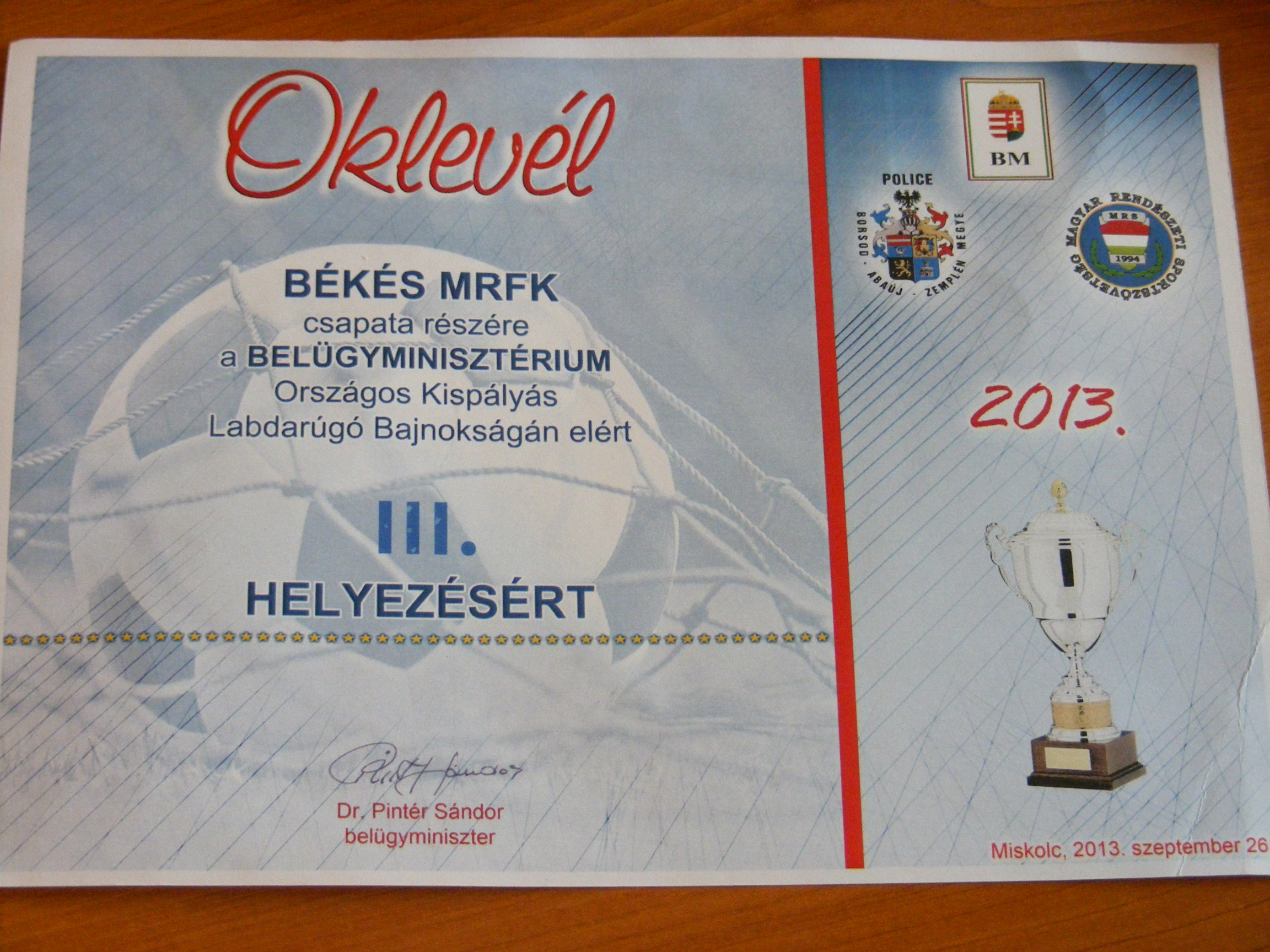 A Békés Megyei Rendőr-főkapitányság kispályás labdarúgó csapata bronzérmet szerzett a BM országos bajnokságon 2013. szeptember 26-án.