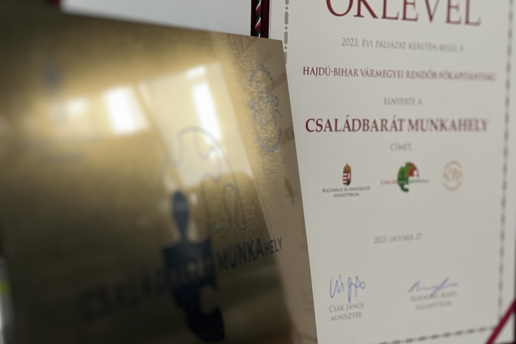 A Hajdú-Bihar Vármegyei Rendőr-főkapitányság minden feltételnek megfelelve, idén elnyerte a Családbarát Munkahely elismeréssel járó emlékplakettet és oklevelet, melyet Budapesten, a Várkert Bazárban 2023. október 27-én megtartott ünnepségen Hornung Ágnes családokért felelős államtitkár adott át.