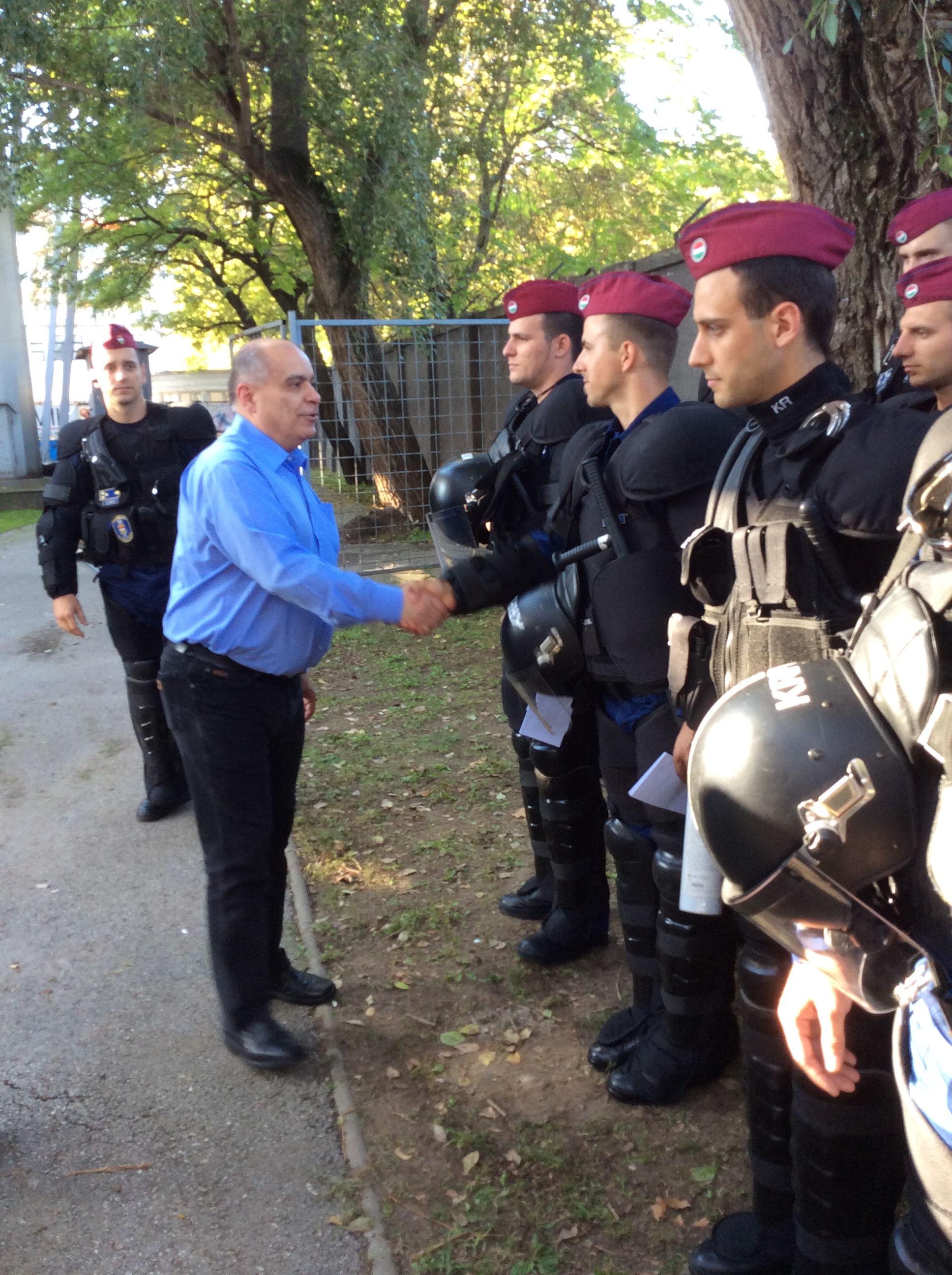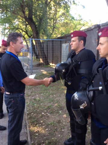 A Készenléti Rendőrség parancsnoka, dr. Balogh János r. vezérőrnagy - feladat végrehajtásuk helyszínén a Szusza Ferenc Stadionban - dicséretben és jutalomban részesített három főt a pécsi bevetési osztály állományából, Papp Károly r. altábornagy, országos rendőrfőkapitány jelenlétében 2014. szeptember 21-én.