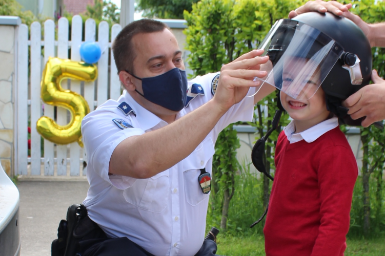 Az ötödik születésnapját ünneplő Örs az első pillanatban ugyan meglepődött a rendőrautó és az egyenruhás bácsi láttán, de hamar otthonosan mozgott. Rutinosan próbálta fel a csapaterős sisakot, a pajzsot, a lövedékálló mellényt. A speciális kiegészítők azonban eltörpültek amellett, hogy igazi rendőrautóba ülhetett, meg persze járt némi ajándék is.