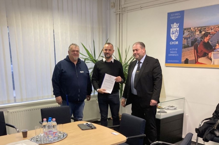 Dr. Varga Péter rendőr dandártábornok, megyei rendőrfőkapitány és Reider Ernő Róbert, valamint Kovács Sándor Győr-Pér Repülőtér Kft. ügyvezetői igazgatói 2022. december 8-án hatósági szerződést írtak alá a péri repülőtér objektumában.
