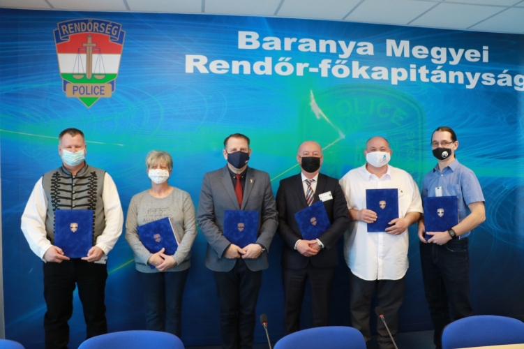 Dr. Gulyás Zsolt rendőr dandártábornok, megyei rendőrfőkapitány és Németh László, a Pécsi Morpheus Állatmentő Alapítvány elnöke; Gelányi Attila, a Komlói Állatvédő Közhasznú Egyesület képviselője; Pávkovics Gábor, a Mohácsi Kutyatár állatmenhely képviselője; Nagy Zoltánné, a Siklósi Tenkesalja Állatvédő Egyesület elnöke és Cziner Gábor, a Szentlászlói Szivárványvarázs Egyesület elnöke együttműködési megállapodást írtak alá 2022. február 18-án a Baranya Megyei Rendőr-főkapitányság tanácstermében.
