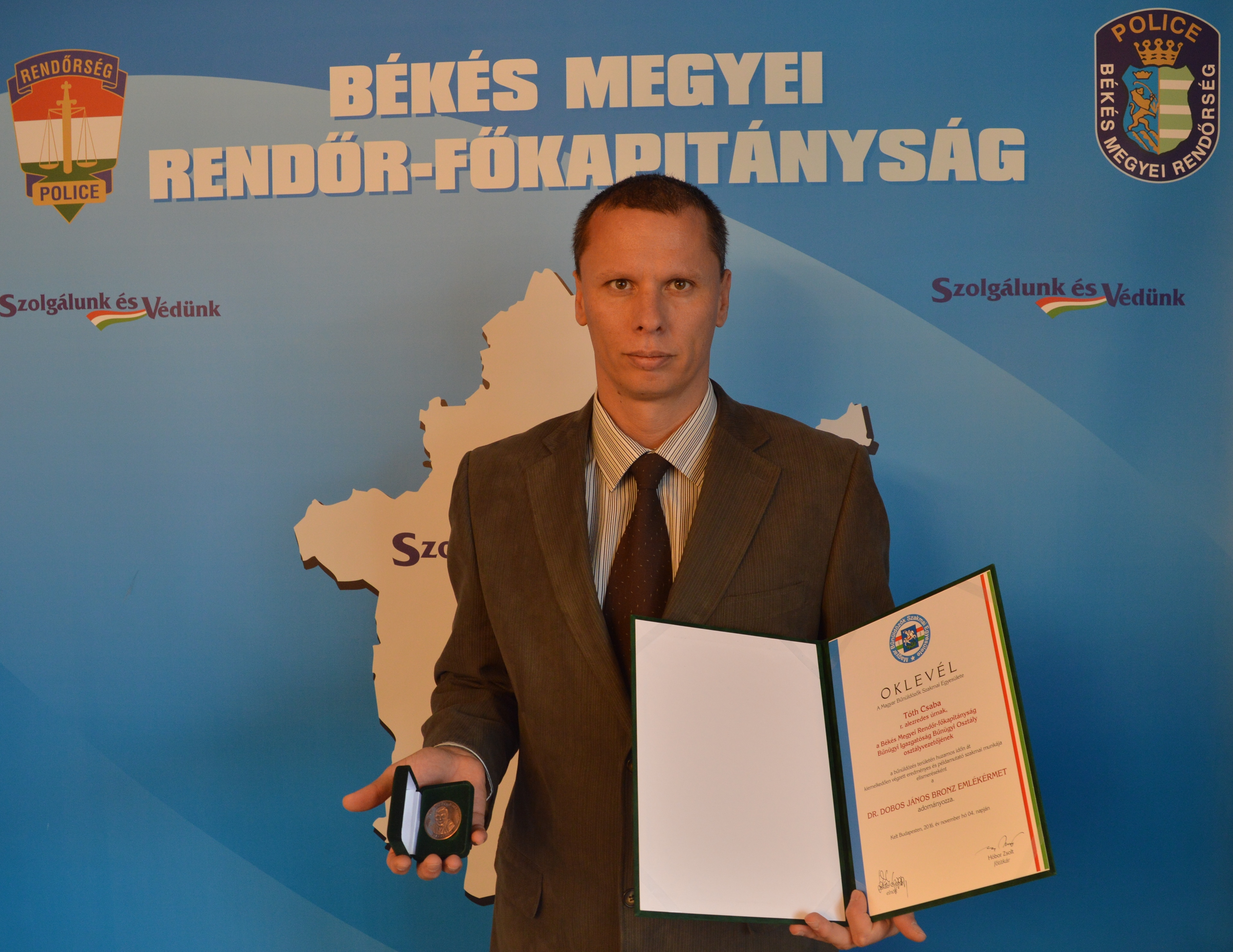 Dr. Dobos János Bronz Emlékérem elismerésben részesült Tóth Csaba r. alezredes, a Békés Megyei Rendőr-főkapitányság Bűnügyi Osztályának vezetője.