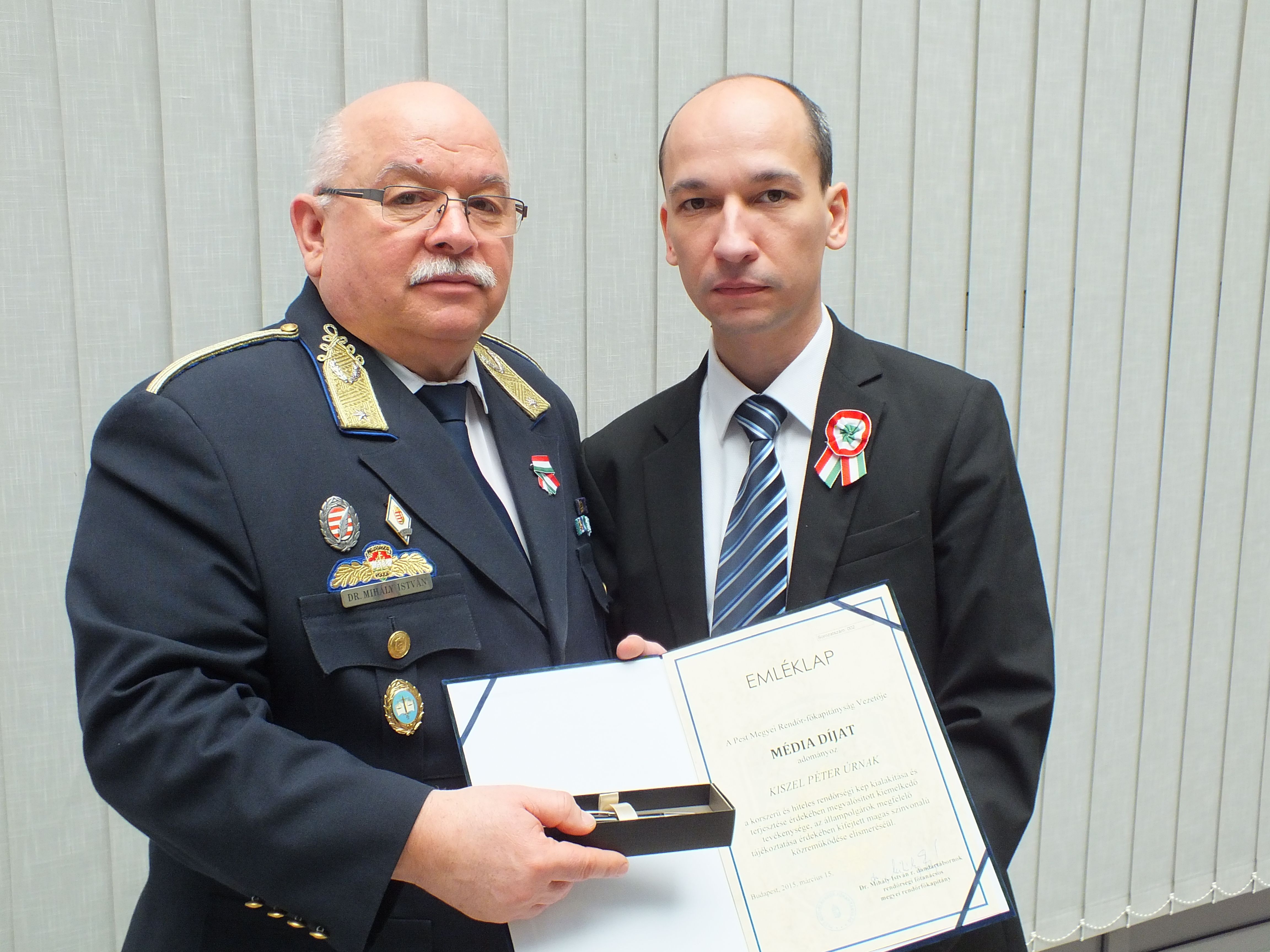 A korszerű és hiteles rendőrségi kép kialakítása és terjesztése érdekében tett kiemelkedő tevékenysége, az állampolgárok megfelelő tájékoztatása érdekében kifejtett magas színvonalú közreműködése elismeréséül – a Magyar Sajtó Napja alkalmából - Média díjat adományozott Dr. Mihály István r. dandártábornok Knáb Imolának, a Zsaru Magazin munkatársának, valamint Kiszel Péternek, a Ceglédi Városi Televízió gyártásvezetőjének.