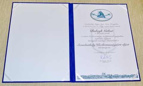 A „Szombathely Közbiztonságáért-díj” kitüntetettje a 2014. évben Balogh Gábor r. alezredes, a Szombathelyi Rendőrkapitányság Bűnügyi Osztályának vezetője lett.