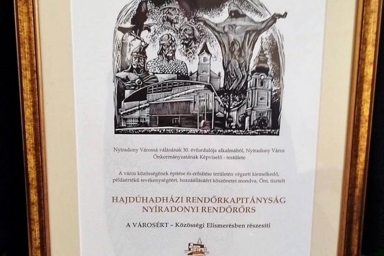 Ünnepi testületi üléssel zárta 2022. december 16-án Nyíradony város önkormányzatának képviselő testülete, a várossá válása 30. évfordulója alkalmából meghirdetett jubileumi emlékévet. Az ünnepi testületi ülésen a Hajdúhadházi Rendőrkapitányság Nyíradonyi Rendőrőrse „A VÁROSÉRT – Közösségi Elismerésben” részesült. Az elismerést dr. Beregi László r. őrnagy őrsparancsnok vette át.