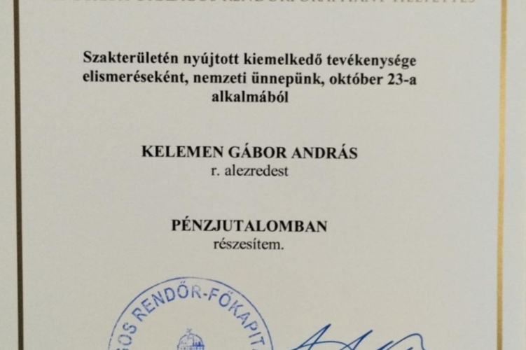Dr. Kuczik János Zoltán r. vezérőrnagy, rendőrségi főtanácsos, rendészeti országos rendőrfőkapitány-helyettes nemzeti ünnepünk, október 23-a alkalmából szakterületén nyújtott kiemelkedő tevékenysége elismeréseként dicséretben és jutalomban részesítette Kelemen Gábor András r. alezredest, a Nógrád Vármegyei Rendőr-főkapitányság Tevékenységirányítási Központ ügyeletvezetőjét.