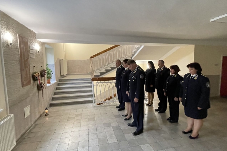 A Nógrád Megyei Rendőr-főkapitányságon Kocsis János határőr százados, Nyikos Sándor határőr törzsőrmester és Sipka József határőr törzsőrmester hősi halottak tiszteletére kifüggesztett emléktábla előtt rótták le kegyeletüket a rendőr-főkapitányság vezetői 2022. október 28-án.