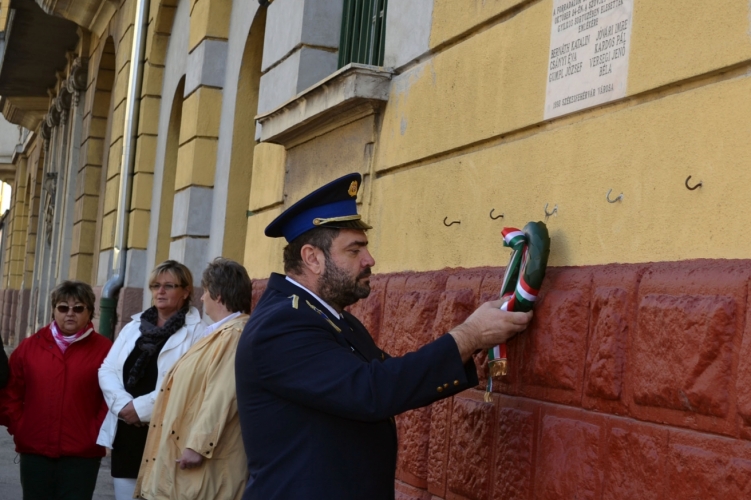Dr. Varga Péter rendőr ezredes, Fejér megye rendőrfőkapitánya a megemlékezés koszorúját 2014. október 31-én reggel a főkapitányságnak helyet adó Szabó Palota oldalán elhelyezett emlékmű előtt. A márványtábla Jóvári Imre rendőr százados és Kardos Pál rendőr alhadnagy emlékére készült, akik 1956. október 24-én a főkapitányság épülete előtti gépfegyvertűz következtében vesztették életüket.