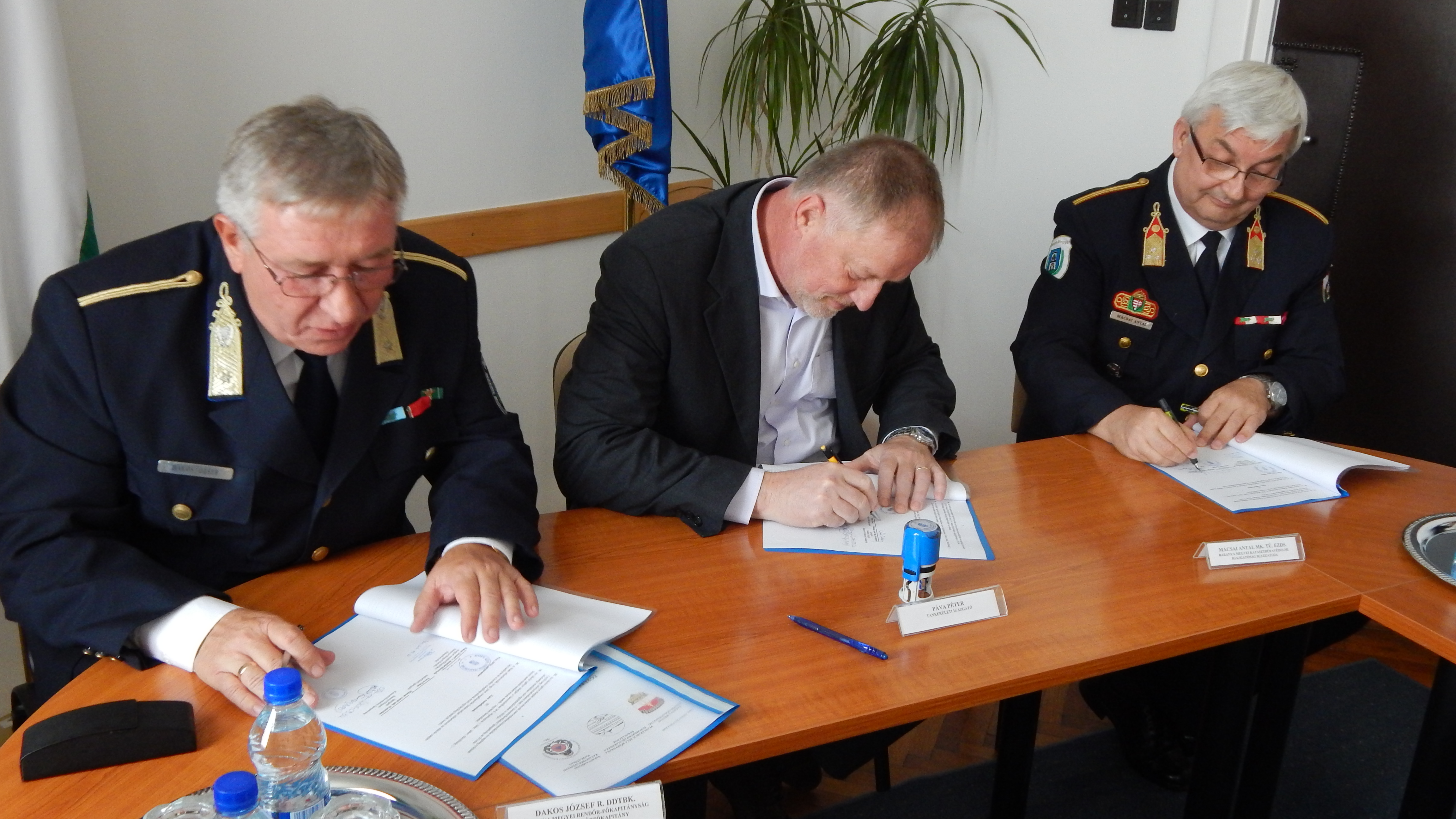 Az együttműködési megállapodást Mácsai Antal tű. ezredes megyei katasztrófavédelmi igazgatóság igazgatója, Páva Péter Klebelsberg Intézményfenntartó Központ Pécsi tankerületi igazgatója és Dakos József rendőr dandártábornok, megyei rendőrfőkapitány írták alá.