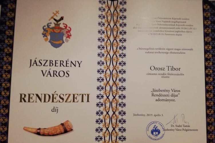A magas színvonalon végzett szakmai tevékenysége és példamutató munkája elismeréseként a Jászberény Város Rendészeti díjat idén Orosz Tibor címzetes rendőr főtörzszászlós, a Jászberényi Rendőrkapitányság megbízott bűnmegelőzési és értékelő előadója vehette át a rendezvényen.