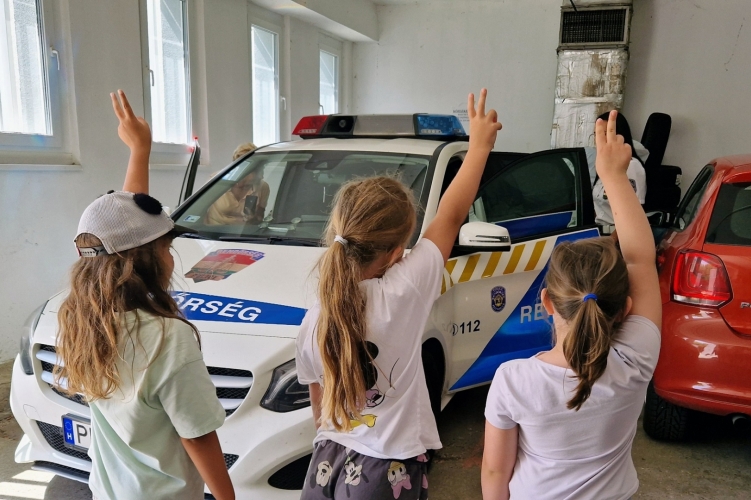 Mindenről is szó esett, a 112 segélyhívó telefonszámról, a közlekedési szabályokról és azok fontosságáról, a fürdőzés, a nyár esetleges veszélyeiről. A komoly témákat egy sétával vezették le, majd birtokba vették a bűnügyi technika szegletét és a garázsban hűsölő csíkos autót is.