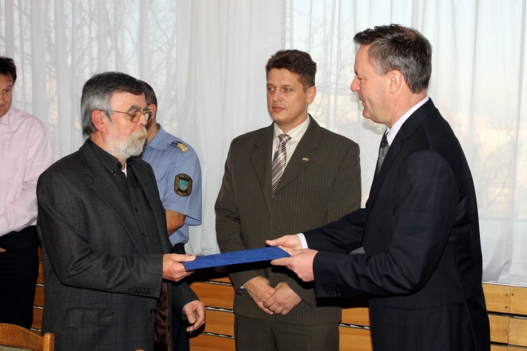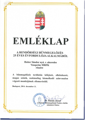 A rendőrségi bűnmegelőzés 25 éves évfordulója alkalmából - a bűnmegelőzés területén kifejtett, elkötelezett, magas szintű, szakmailag kiemelkedő színvonalon végzett munkájának elismeréséül - emléklapot adományozott Dr. Hatala József miniszteri biztos, a Nemzeti Bűnmegelőzési Tanács elnöke Heiter Sándor nyugállományú rendőr alezredesnek.