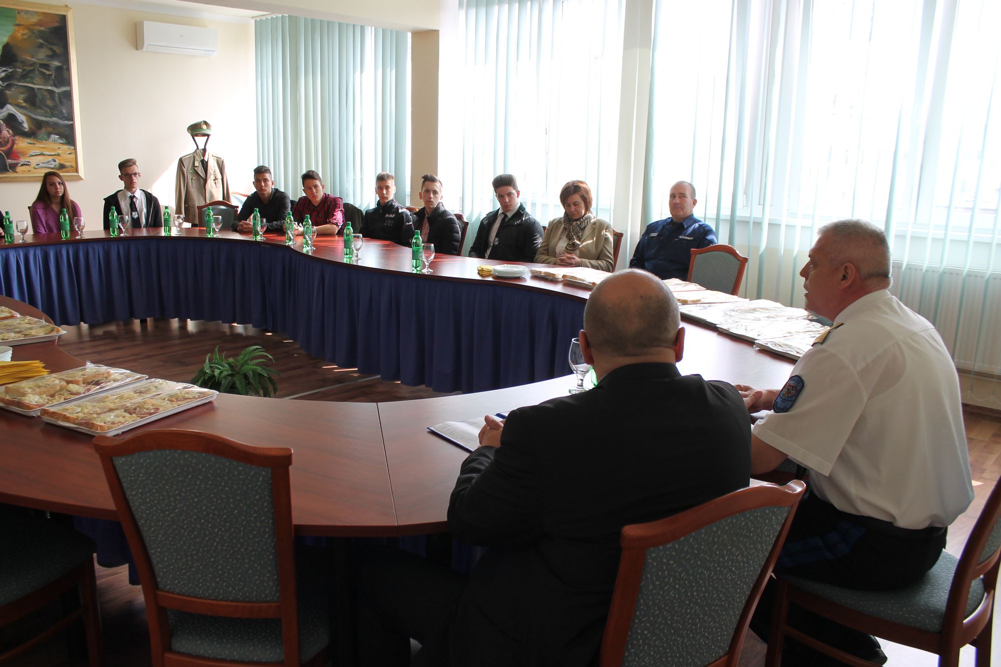 Farkas József r. dandártábornok megyei rendőrfőkapitány látta vendégül a Mátészalkai Szakképzési Centrum Budai Nagy Antal Szakgimnázium rendészet és közszolgálat ágazati képzésében tanuló fiatalokat 2017. április 12-én a Szabolcs-Szatmár-Bereg Megyei Rendőr- főkapitányság központi objektumában. Rendőrfőkapitány úr tartott a diákoknak tájékoztatót a rendőr-főkapitányság szervezeti felépítéséről és működéséről, valamint a pályaválasztás előtt álló fiatalok számára rávilágított az elkötelezettséget igénylő hivatásos szolgálattal járó előnyökre, a szakma érdekességeire és szépségére. A Tevékenység- irányítási Központban zajló munkafolyamatokba Gaszper Róbert r. alezredes vezette be a diákokat. A bűnügyi- technikai munka sokszínűségéről Sógor Csaba r. alezredes osztályvezető beszélt a fiataloknak. A főkapitányság bűnmegelőzési tevékenységéről - amelynek egyik célcsoportja a jelenlévő hallgatóságot is alkotó fiatalok - dr. Kovács Attila r. alezredes osztályvezető tájékoztatta.