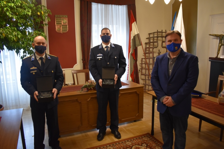 Sasfalvi István rendőr zászlós és Nagy Balázs rendőr főtörzsőrmester ajándékcsomagot és emlékplakettet vehetett át dr. Szebegyinszki Attila, Kondoros városának jegyzőjétől.