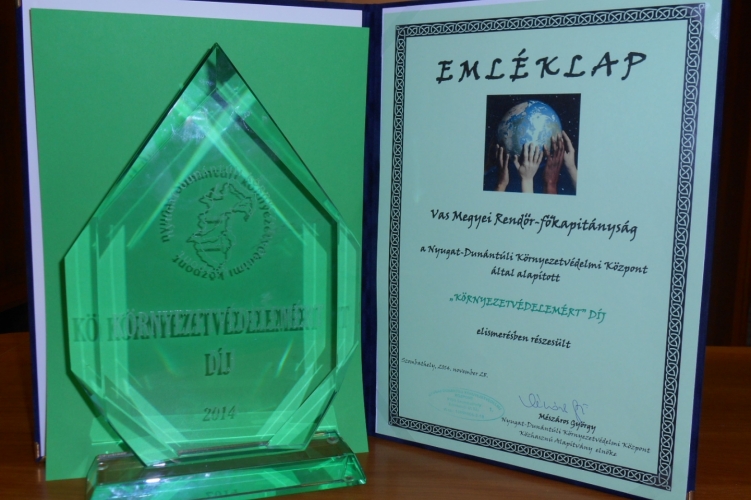 A Nyugat-dunántúli Környezetvédelmi Központ a jogsértésekkel szembeni hatékony fellépésre tekintettel köszönetét fejezte ki a főkapitányságnak, valamint a környezetvédelmi bűnmegelőzéssel foglalkozó Némethné dr. Zsigó Zita r. alezredes asszonynak. Az ünnepélyes keretek között átadott „Környezetvédelemért-díj” elismerést a főkapitányság nevében Erhardt László r. ezredes úr, a Vas Megyei Rendőr-főkapitányság gazdasági főkapitány-helyettese vehette át ünnepélyes keretek között 2014. november 28-án.