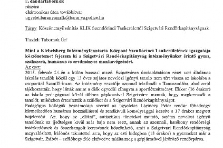 A Klebelsberg Intézményfenntartó Központ Szentlőrinci Tankerületének igazgatója levélben fejezte ki köszönetét a Szigetvári Rendőrkapitányság humánus, gyors és eredményes munkavégzéséért.