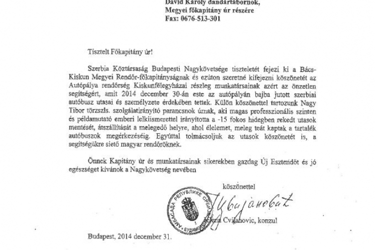 Helena Cvijanovic szerb konzul 2014. december 31-én délelőtt, faxon küldött levelében köszönte meg Dávid Károly r. dandártábornok úrnak, a Bács-Kiskun Megyei Rendőr-főkaptányság vezetőjének a bajbajutott utasok és az autóbusz személyzete érdekében tett intézkedéseket.
