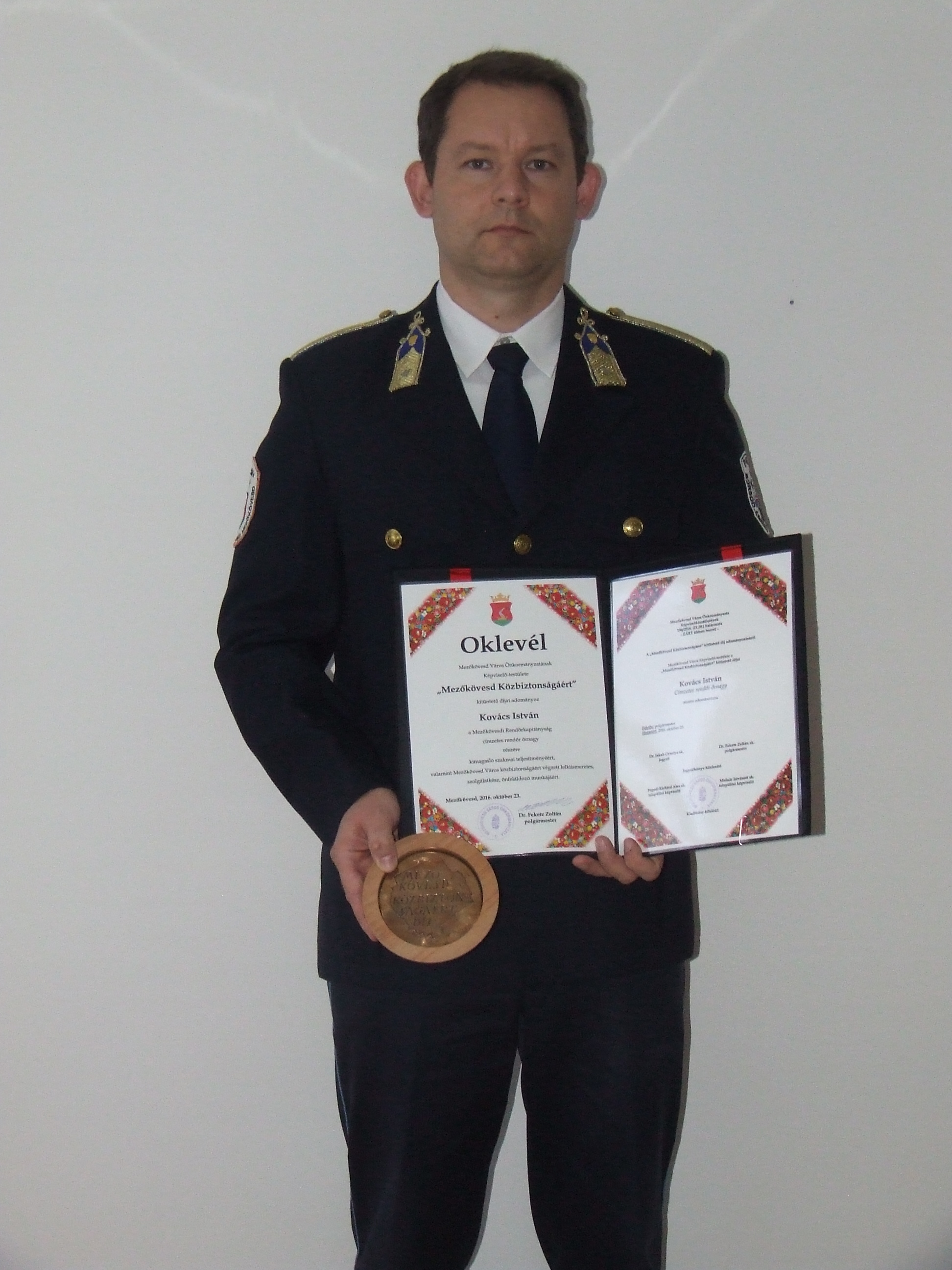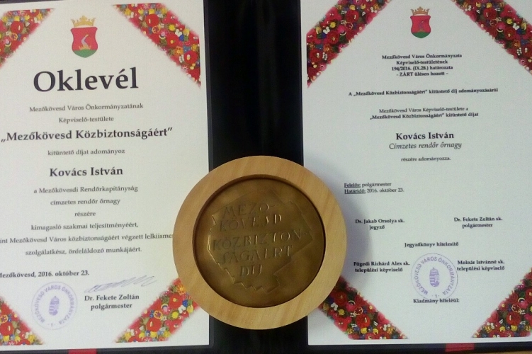 A díjat dr. Fekete Zoltán Mezőkövesd polgármestere adta át elismerésként a fővizsgáló több éves, Mezőkövesd város kultúrtörténetéért, - különös tekintettel annak rendészeti területen - végzett munkájáért.