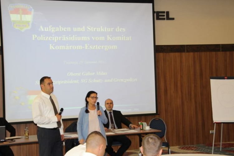 A rendészeti vezetőket Milus Gábor r. ezredes rendészeti főkapitány-helyettes, valamint Buzonics Ferenc r. ezredes gazdasági főkapitány-helyettes fogadta és mutatta be részükre a Komárom-Esztergom Megyei Rendőr-főkapitányság szervezeti felépítését, működését.