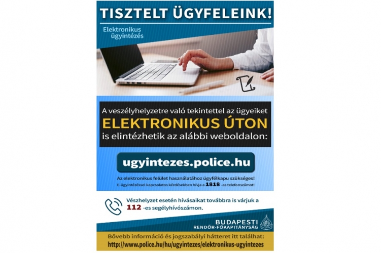 Az egészségmegőrzés és a vírus terjedésének korlátozása érdekében ugyanakkor kérjük ügyfélkapuval rendelkező ügyfeleinket, hogy részesítsék előnyben az elektronikus ügyintézés lehetőségét. További információt a http://www.police.hu/hu/ugyintezes/elektronikus-ugyintezes oldalon talál.