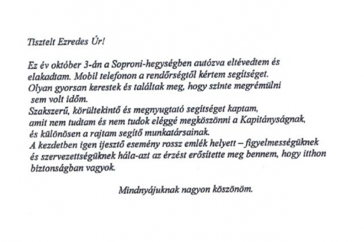 Levélben is megköszönte a soproni rendőrök segítségét az az idős asszony, aki még október elején került bajba a Soproni-hegységben.