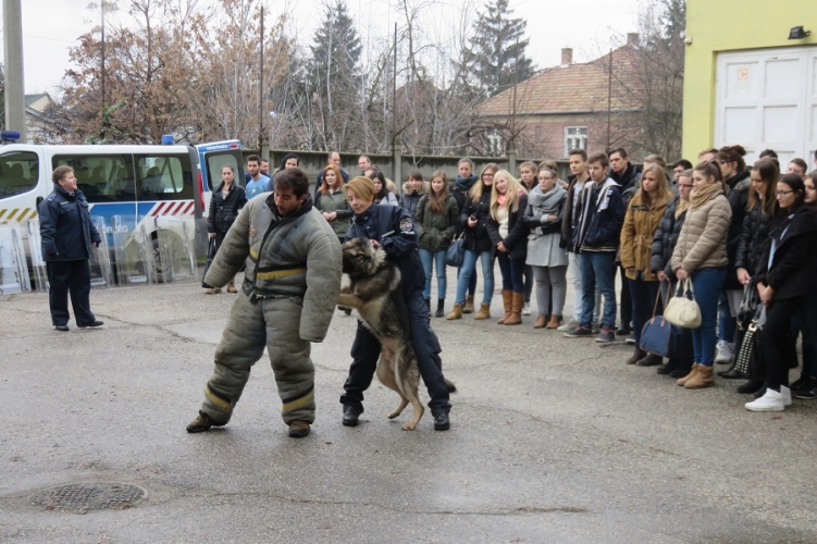 A rendőrök azt is megmutatták a diákoknak, milyen felszerelésben vonulnak ki egy sportrendezvény biztosítására, ahol számítani lehet a felek jogsértő magatartására és ezáltal a velük szembeni intézkedésre. Fiatalok alkották a tömeget és a velük szemben sorfalat állókat.