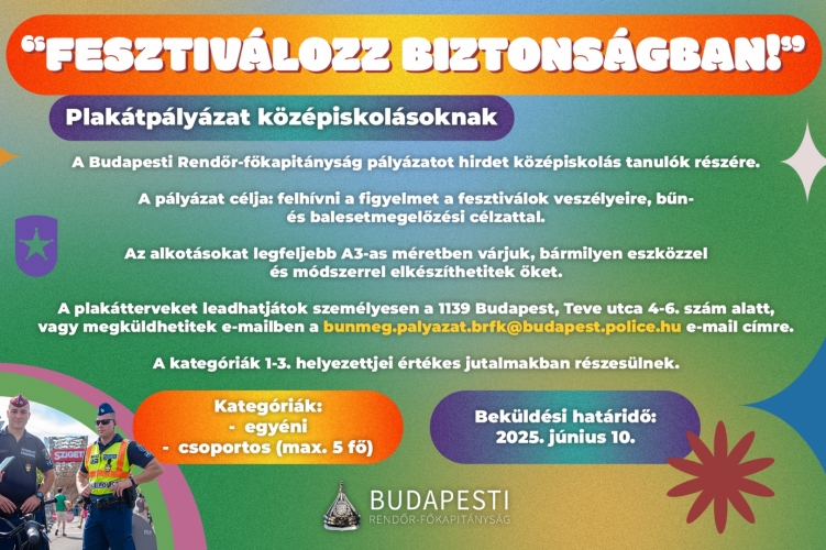 A Budapesti Rendőr-főkapitányság plakátpályázatot hirdet középiskolások számára, amelynek célja a nyári fesztiválok biztonságosabbá tétele. A pályázat középpontjában a bűn- és balesetmegelőzés áll, különös tekintettel a nagy tömegrendezvényeken előforduló kockázatokra. A diákok feladata, hogy kreatív plakátterveikkel hívják fel a figyelmet a veszélyekre, és tudatos, felelősségteljes döntésekre ösztönözzenek.