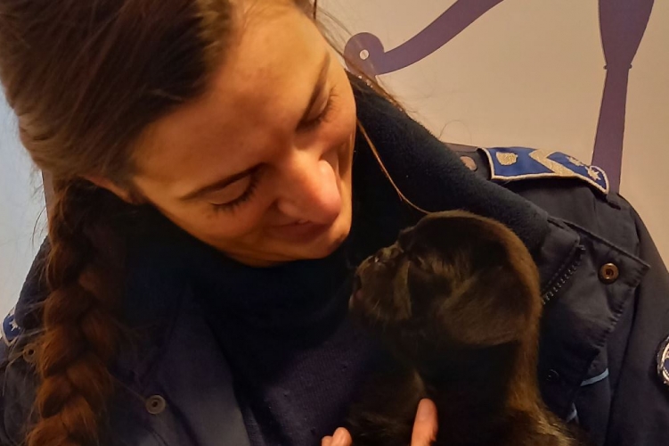 Kocsis Ramóna törzsőrmester és új párja 2022. december 1-jén reggel találkoztak Monoron. A lány gépkocsival járőrözött, amikor észrevette az utcán egyedül szaladgáló fekete fiút. Azonnal megesett a szíve a csípős időben magányosan és céltalanul futkosón, satufékezett, majd felnyalábolva és magához ölelve melengette, miközben próbálta a kóborló hozzátartozóit felkutatni a környéken. Nem járt sikerrel, ezért átmenetileg új családot szerzett az igéző szemű szőrgombócnak: meg sem állt vele a rendőrkapitányság épületéig. Pillanatok alatt népes rajongótábor gyűlt köréjük, etetéssel, itatással, simogatással, babusgatással telt az idő. A névadást a törzsőrmester főnöke intézte, nemes egyszerűséggel fiúsította beosztottja keresztnevét, így lett a névtelen kölyökkutyából Rambo.