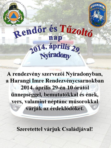 Rendőr- és Tűzoltónap Nyíradonyban Megosztás A Hajdú-Bihar Megyei Rendőr-főkapitányság és a Hajdú-Bihar Megyei Katasztrófavédelmi Igazgatóság 2014. április 29-én Nyíradonyban rendezi meg a Rendőr- és Tűzoltónapot.