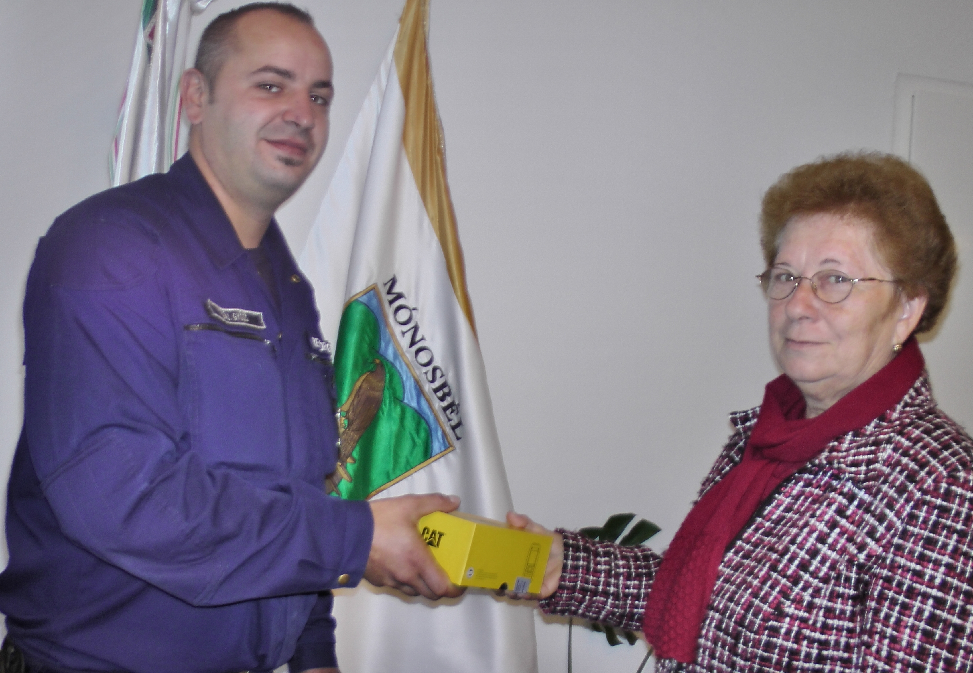 Varga Sándorné polgármester 2014. október 20-án adta át Gál Győző r. törzsőrmesternek a munkáját nagyban segítő víz, por és ütésálló készüléket.