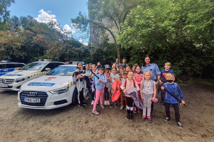 Ekkora lelkesedés láttán a kapitányság dolgozói sem tehettek mást, a mosolyokat viszonozva a belső udvarra invitálták a kis csapatot. A gyermekek közelebbről is megnézhették egy rendőrautót, megismerkedtek a rendőrök szolgálati felszereléseivel, feladataival és arról is szót ejtettek, hogy kitől és hogyan tudnak segítséget kérni, ha bajba kerülnének.