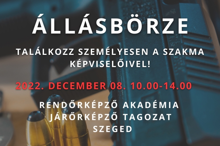 A Magyar Rendőrség 2022. december 8-án 10 órától 14 óráig állásbörzét tart Szegeden a Rendőrképző Akadémia Járőrképző Tagozatán (Bajai út 14.).