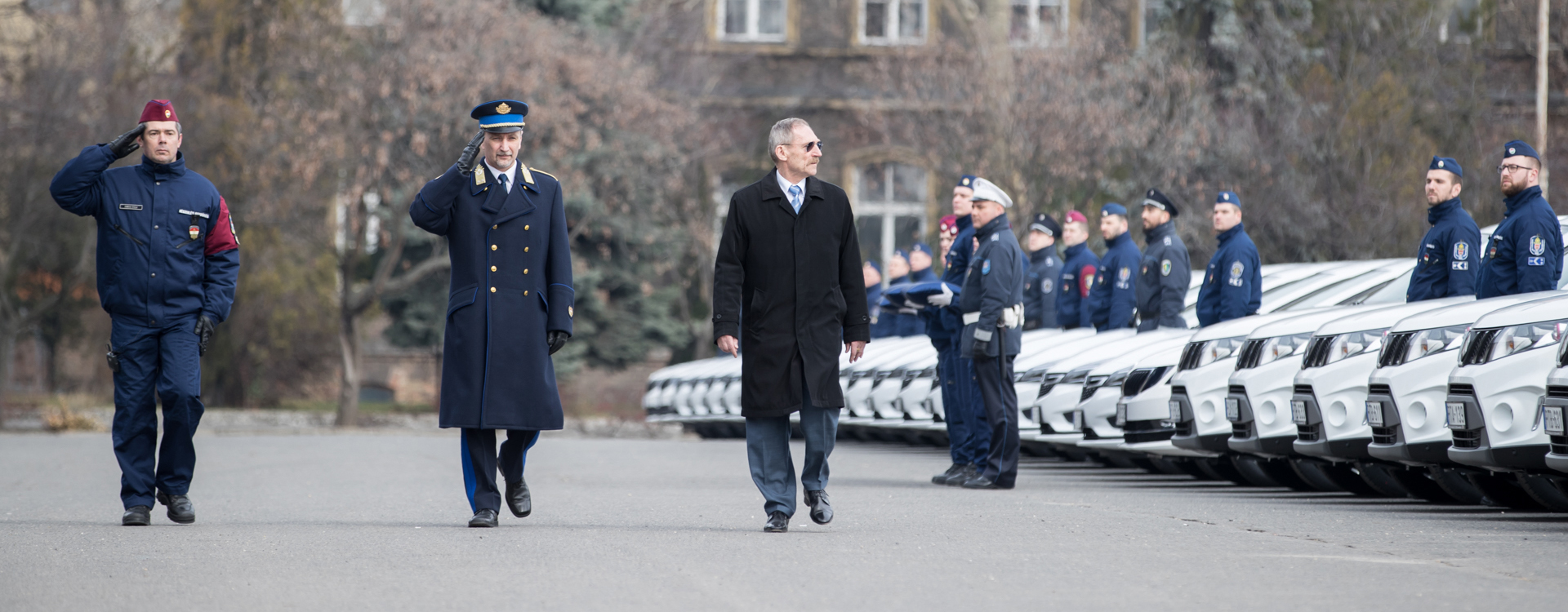Dr. Pintér Sándor, Magyarország belügyminisztere és Papp Károly r. altábornagy, országos rendőrfőkapitány új szolgálati gépkocsikat adott át 2018. március 23-án Budapesten, a Készenléti Rendőrség központi objektumában.